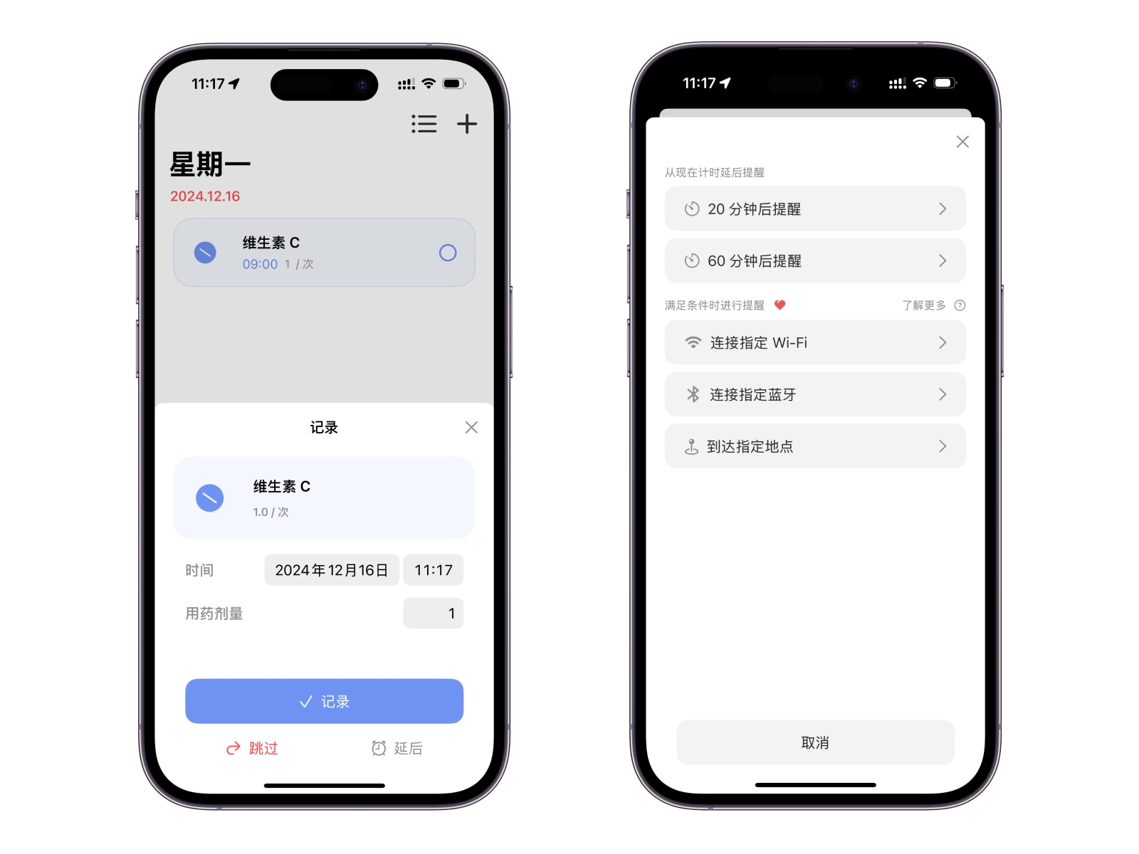 当已到达你的用药时间但是药品刚好不在身边或不方便用药时，除了可以选择延后一段时间外，你还可以选择 「连接指定蓝牙」 提醒，在合适的时机和场合中提醒用药