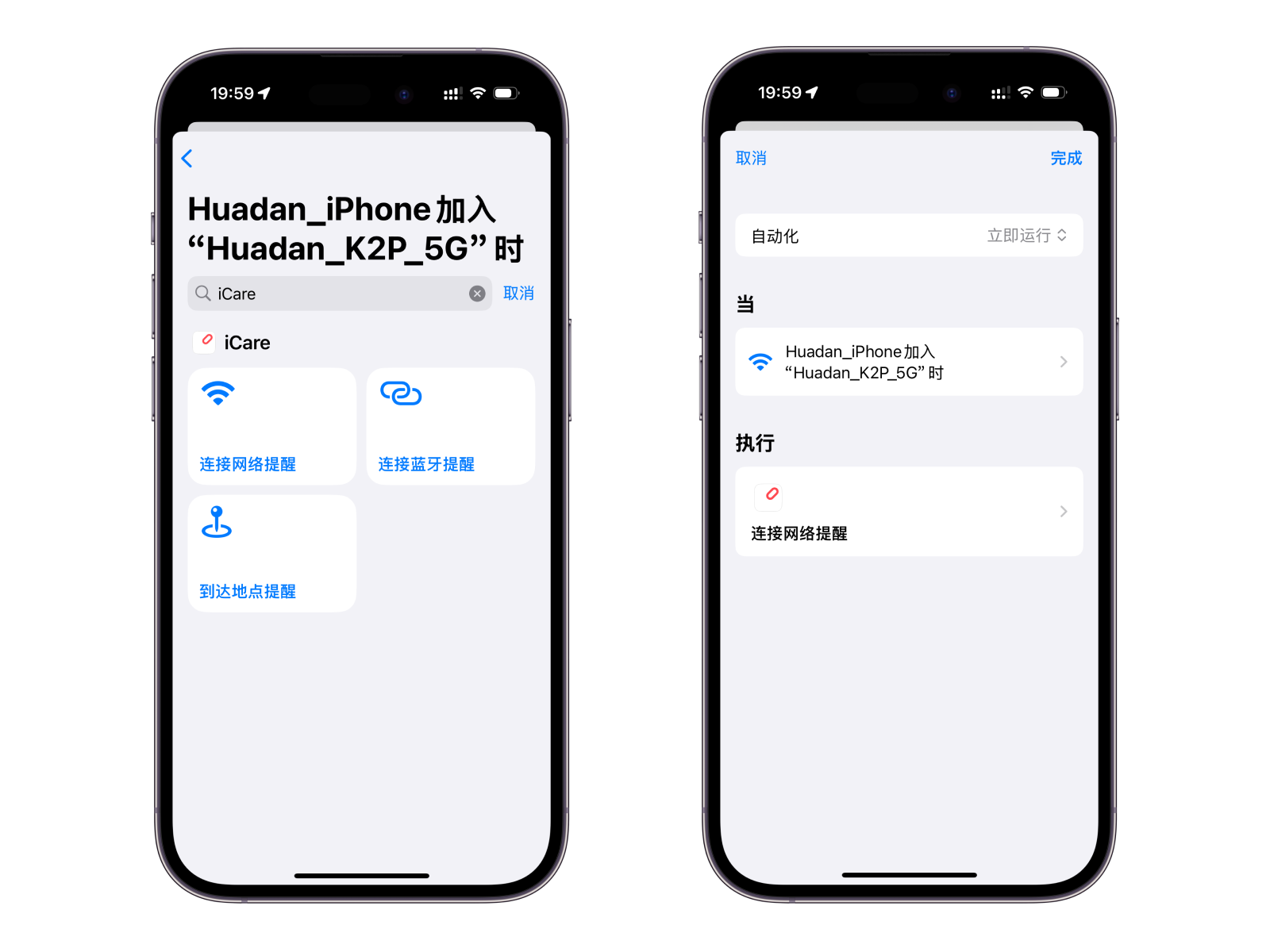 7. 在选择执行操作中，点击搜索框输入 「iCare」 进行搜索，在搜索结果选择 「连接蓝牙提醒」 选项